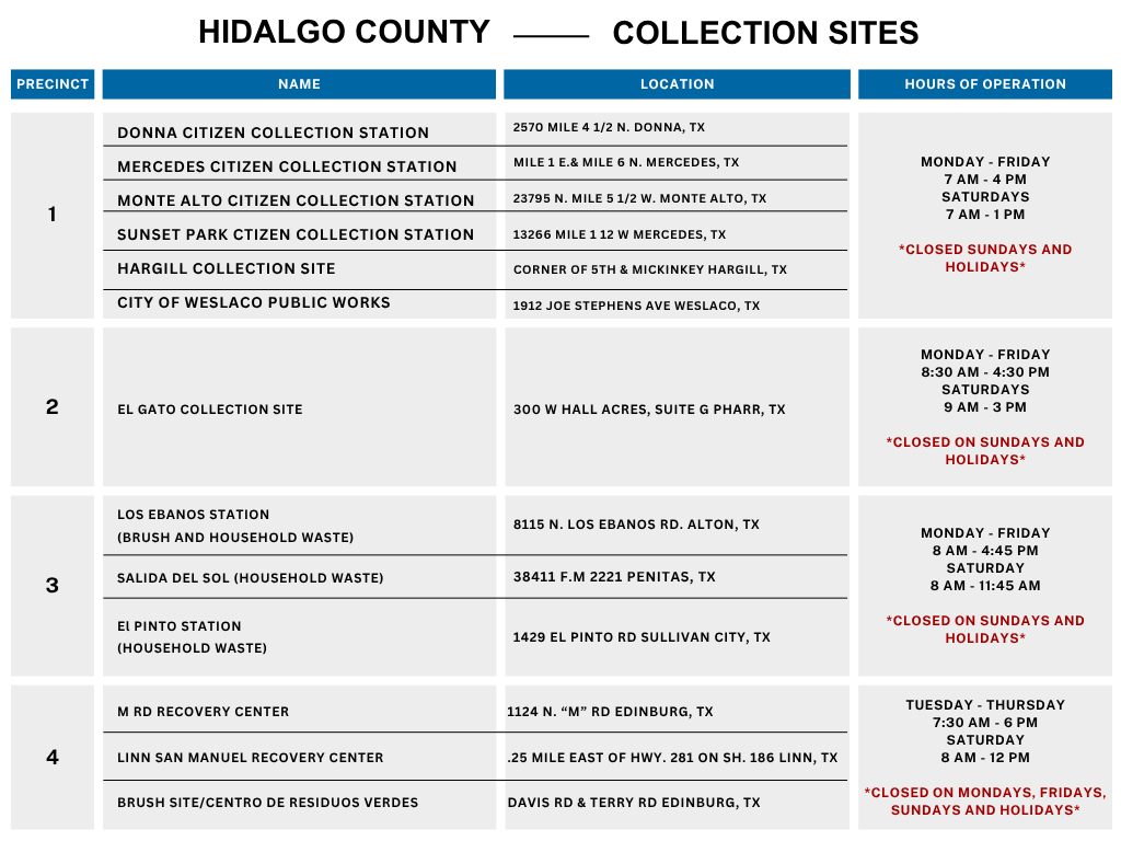 If you or your neighbor need to throw away tires, furniture, etc. you can visit any of the collection sites across the Hidalgo County. More information is listed below.